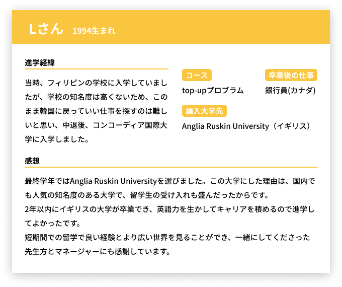 日本の大学を卒業した人には得られない、就職のチャンスが得られます。 例えば、1年目から海外のチームに派遣されたり、即戦力とみなされ平均給料が非常に高い採用となる可能性があります。 さらに、海外の大学を卒業することによって、海外大学を卒業した人のみの選考フローに参加できたり、 企業側から学生にスカウトされる場合があります。そのため、ご自身の理想の企業を選ぶことができます。