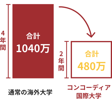通常の海外大学の費用はおよそ1040万円。 それに対しコンコ―ディア国際大学の提供している新・コミュニティーカレッジ制度であれば、時間が短い分、学費は480万円~に抑えられます。