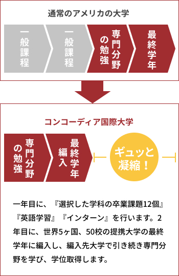 通常の海外大学は4年間で卒業しますが、 コンコーディア国際大学はその半分の2年間で卒業できるので、余った時間を有効に活用できます。