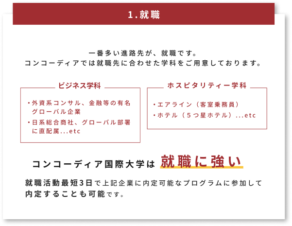日本の大学を卒業した人には得られない、就職のチャンスが得られます。 例えば、1年目から海外のチームに派遣されたり、即戦力とみなされ平均給料が非常に高い採用となる可能性があります。 さらに、海外の大学を卒業することによって、海外大学を卒業した人のみの選考フローに参加できたり、 企業側から学生にスカウトされる場合があります。そのため、ご自身の理想の企業を選ぶことができます。
